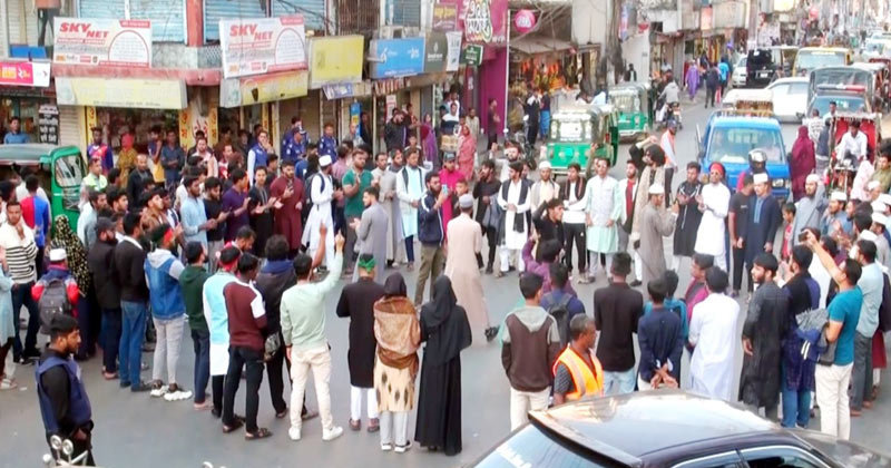 এর আগে বিক্ষুব্ধ ছাত্র-জনতা মিছিল নিয়ে শহরের চৌমূহনা চত্বরে জড়ো হতে থাকেন এবং ভারত ও আওযামী লীগ বিরোধী বিভিন্ন স্লোগান দেন। এসময় আন্দোলনকারীরা তুমি কে আমি কে, হাদি, হাদি। আমরা সবাই হাদি হবো,  যুগে যুগে লড়ে যাবো। গোলামি না, আজাদী, আজাদী, আজাদী। দিল্লি না, ঢাকা, ঢাকা, ঢাকা। আমার ভাই কবরে, খুনি কেন বাহিরে। হাদি ভাই মরলো কেন ইন্টেরিম জবাব দে। জাহাঙ্গীর জবাব দে, স্লোগান দিতে থাকেন।